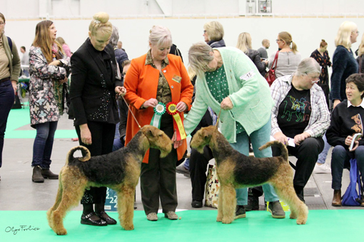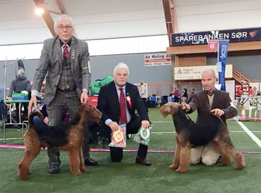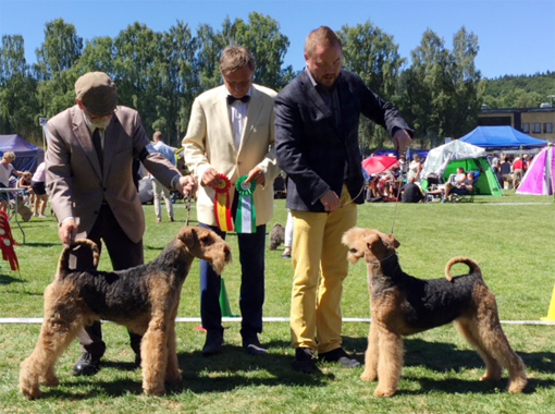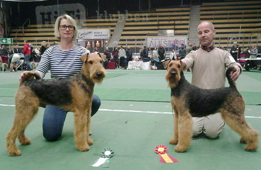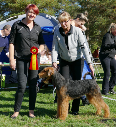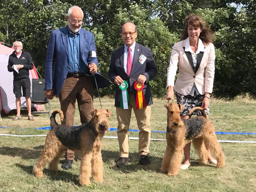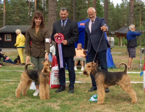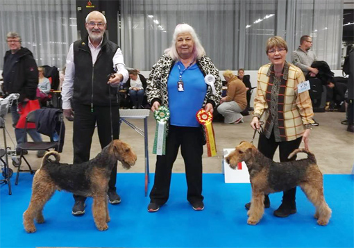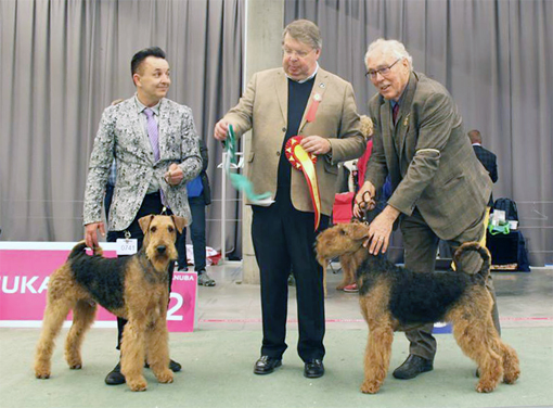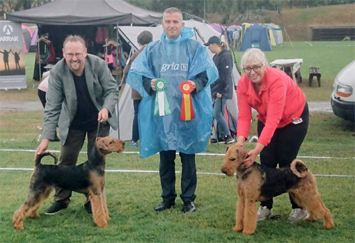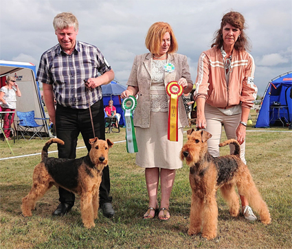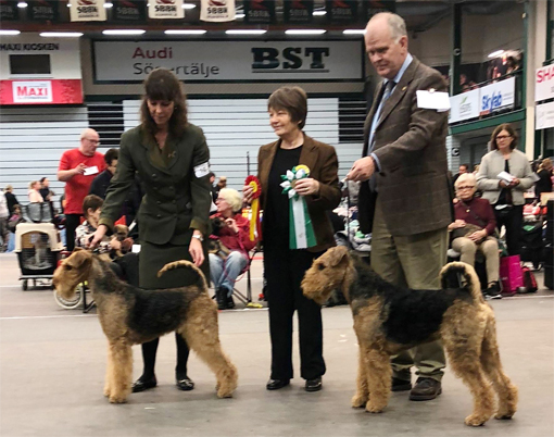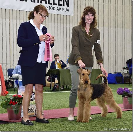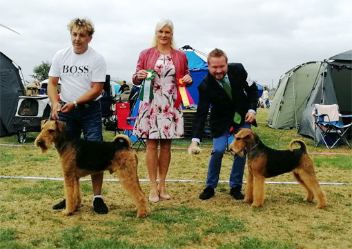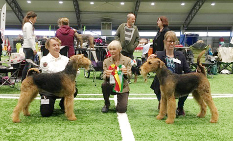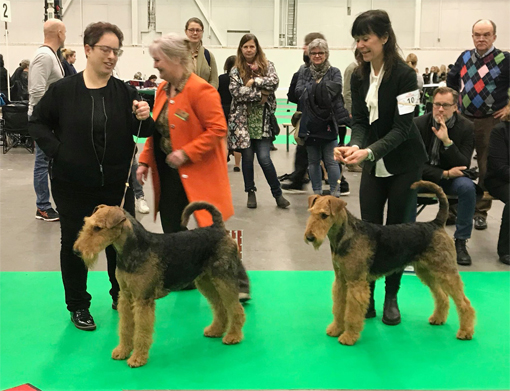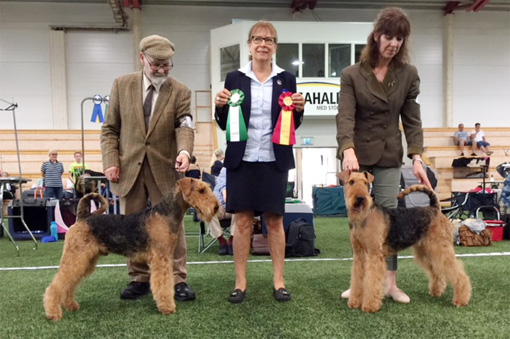 BIR La-Pretas Water Chetnut, till höger tillsammans med Anne Katrine Steffens, och BIM Art Direkt Airedale Cash, till vänster tillsammans med Åke Sandin. Mellan dem domaren Anne Sume. Foto: Gulli Olsson-Sandin