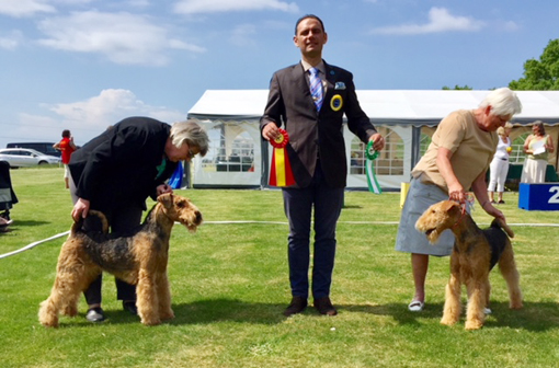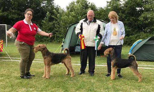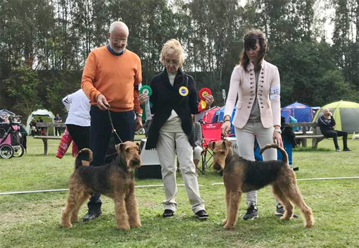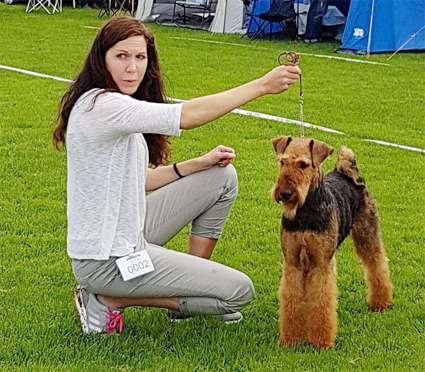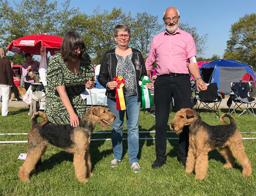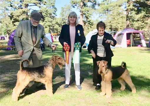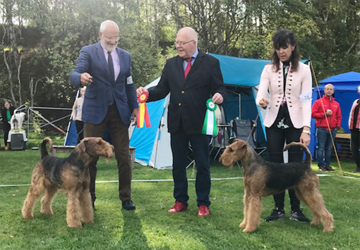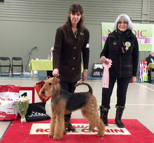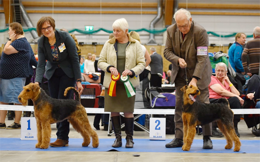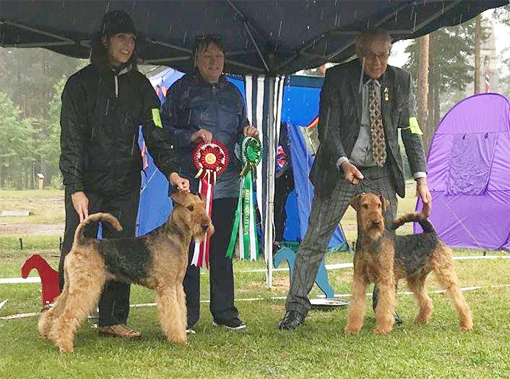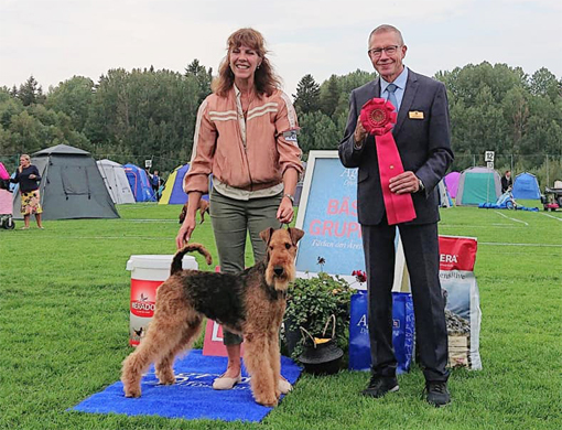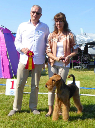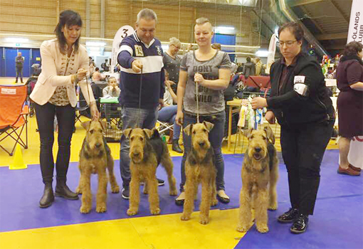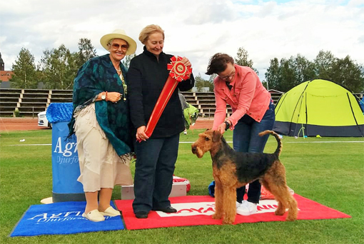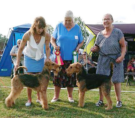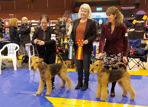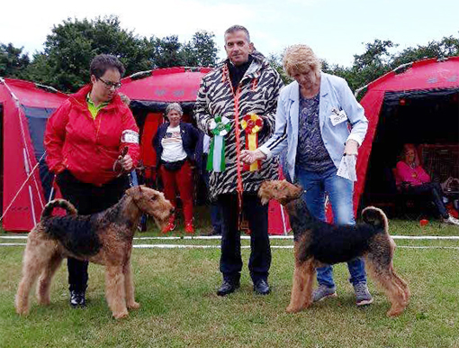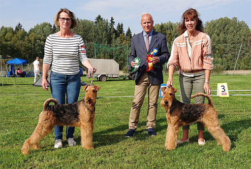BIR La-Pretas Water Chetnut, till höger tillsammans med Anne Katrine Steffens, och BIM Art Direkt Airedale Cash, till vänster tillsammans med Åke Sandin. Mellan dem domaren Anne Sume. Foto: Gulli Olsson-Sandin