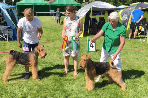 2018-05-11 Roskilde, Danmark. Dansk Kennel Klub, nordisk utställning. Domare Tanya Ahlman-Stockmari. Finland. Två deltagande airedaleterrier.