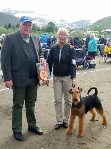 Art Direkt Airedale Bodyguard blev BIR på den nordiska utställningen i Roskilde. Här med Gulli Olsson-Sandin. Foto: Åke Sandin