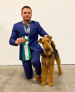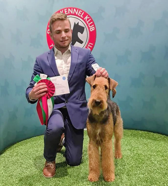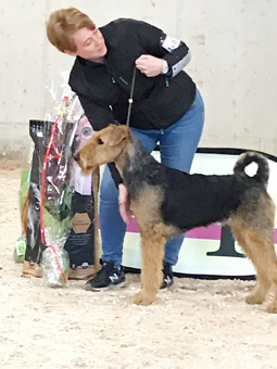 Domare Mats Lindborg. Tre deltagande airedaleterrier.