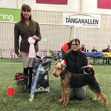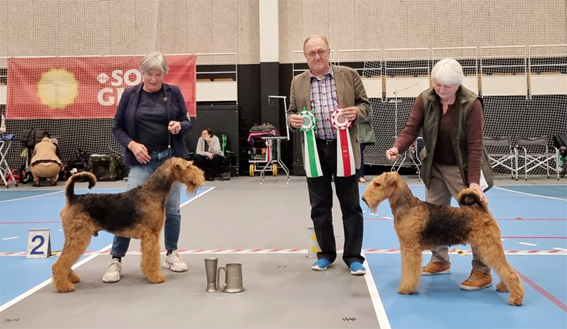 2021-10-09 Njurunda, Sundsvall, Östsvenska Terrierklubben. Domare Carl-Gunnar Stafberg, BIS-domare Monica Vikner-Stafberg. Fyra deltagande airedaleterrier.